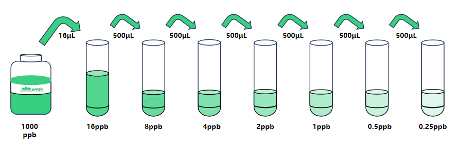 試劑盒中取出標(biāo)準(zhǔn)品,準(zhǔn)備7個試管,先將1000ppb標(biāo)準(zhǔn)品(200µL)按需吸取一定量用1×稀釋液稀釋至16ppb(例:16µL的標(biāo)準(zhǔn)品母液+984µL的1×稀釋液,制備得到1000μL的16ppb濃度標(biāo)準(zhǔn)品),隨后在6個試管中分別加入500μL的1×稀釋液,在這6個單獨的試管中將16ppb標(biāo)準(zhǔn)品依次2倍倍比稀釋至7個梯度,共配制7個濃度的標(biāo)準(zhǔn)品,依次為:16ppb、8ppb、4ppb、2ppb、1ppb、0.5ppb、0.25ppb,從最高濃度標(biāo)準(zhǔn)品溶液中吸取500μL標(biāo)準(zhǔn)品到下一個試管中,輕輕吹打混勻,以此類推進行標(biāo)準(zhǔn)品的倍比稀釋(如圖所示),1×稀釋液用作零濃度標(biāo)準(zhǔn)品(0ppb)。