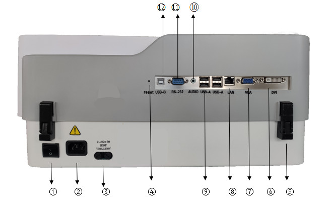 ②內(nèi)置熱敏打印機(jī):塑料蓋板,使用內(nèi)置熱敏打印機(jī)打印報告時的出紙口,打開蓋板可以更換打印紙。